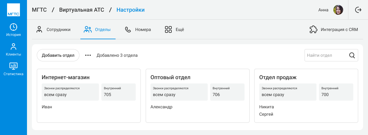 Возможно пересечение с функционалом интеграции CRM. Если ваша ВАТС интегрирована в CRM и звонящий клиент есть в базе CRM, при входящем звонке будет показано имя клиента CRM, а не название отдела. Если вам это не подходит, напишите в нашу поддержку.