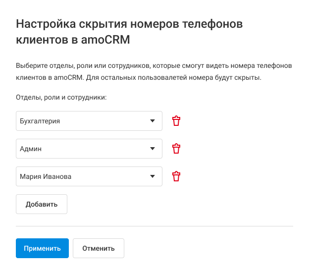 В открывшемся окне выберите отделы, роли или сотрудников, которые смогут видеть номера клиентов. Если таких нет, то оставьте поля пустыми — номера будут маскироваться для всех пользователей.