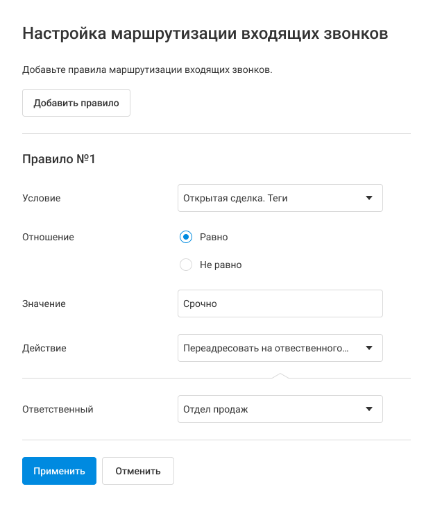 Выберите условие, задайте значение, действие и ответственных. Например, вы можете направить звонки от клиентов с тегом «Открытая сделка» и значением «Срочно» сразу на отдел продаж, а вызовы с тегом «Сервис» и значением «Помощь» — в техподдержку.