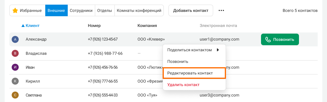 В списке контактов нажмите правую кнопку мыши, выберите «Редактировать контакт» или «Удалить контакт».