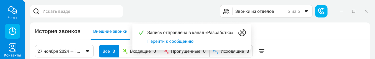 Появится окно с уведомлением об отправке записи. Из него вы можете перейти в чат, куда отправлена запись.