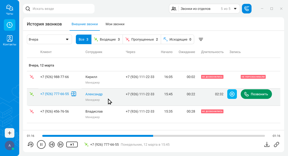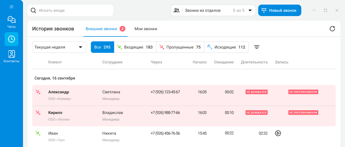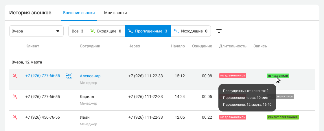 Благодаря фильтру «Контроль пропущенных» вы сможете легко найти непринятые звонки, на которые сотрудники не перезванивали или не дозвонились.