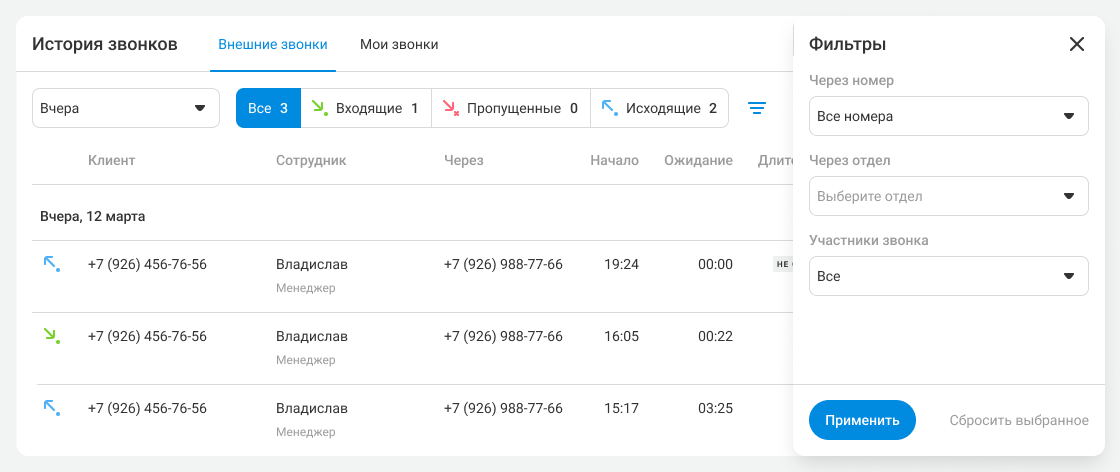 Выберите нужные вам значения фильтров и нажмите «Применить». В таблице останутся только те звонки, которые соответствуют заданным параметрам.