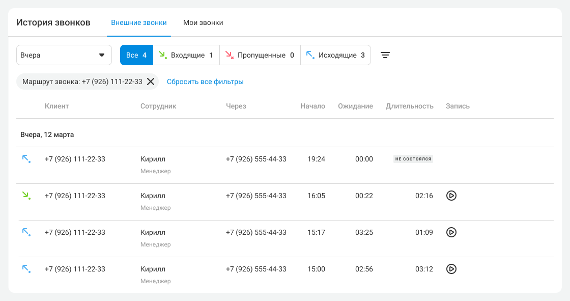 Возможности просмотра истории звонков зависят от уровня прав пользователя.