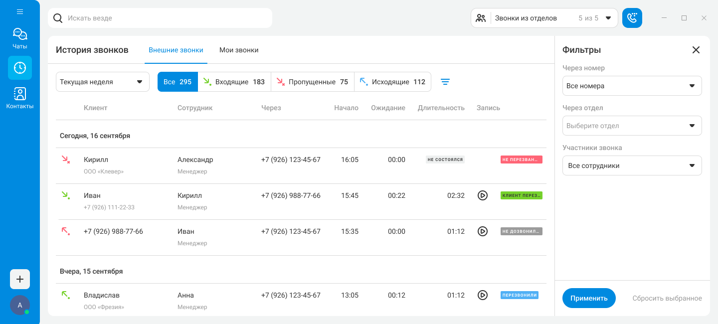 • фильтровать звонки по номерам, отделам, сотрудникам, клиентам и типам вызовов за нужный период;