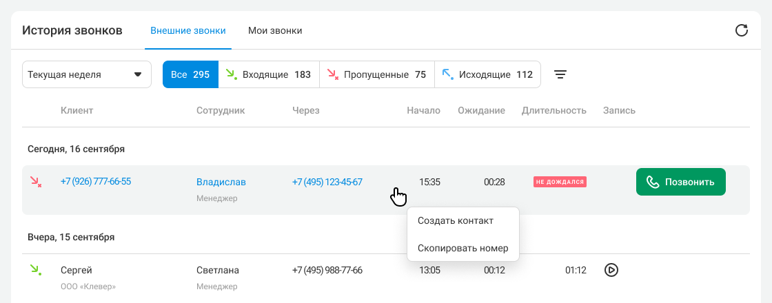 При переходе в историю новый пропущенный звонок подсвечивается красным. Уведомление исчезает, если долго держать вкладку с новым пропущенным открытой или если кто-то из сотрудников перезвонит этому контакту.