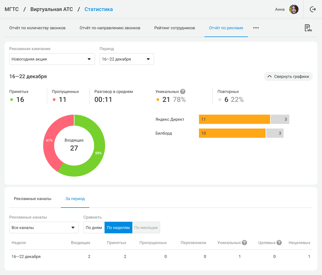 Этот отчет позволяет анализировать эффективность рекламных кампаний в интерфейсе Виртуальной АТС с помощью коллтрекинга.