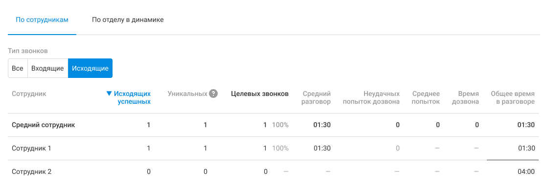 • Средний разговор и Общее время разговора — 1 мин. 30 сек. у первого сотрудника, так как это был единственный звонок за день. У второго сотрудника отображается только общее время в разговоре (4 мин.), так как средний разговор считается только по данным успешных звонков сотрудника.