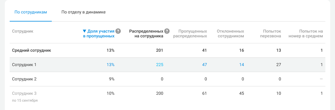 • Доля участия в пропущенных отделом — насколько сотрудник причастен к пропущенным звонкам отдела и на какую долю пропущенных мог бы ответить, но не ответил;