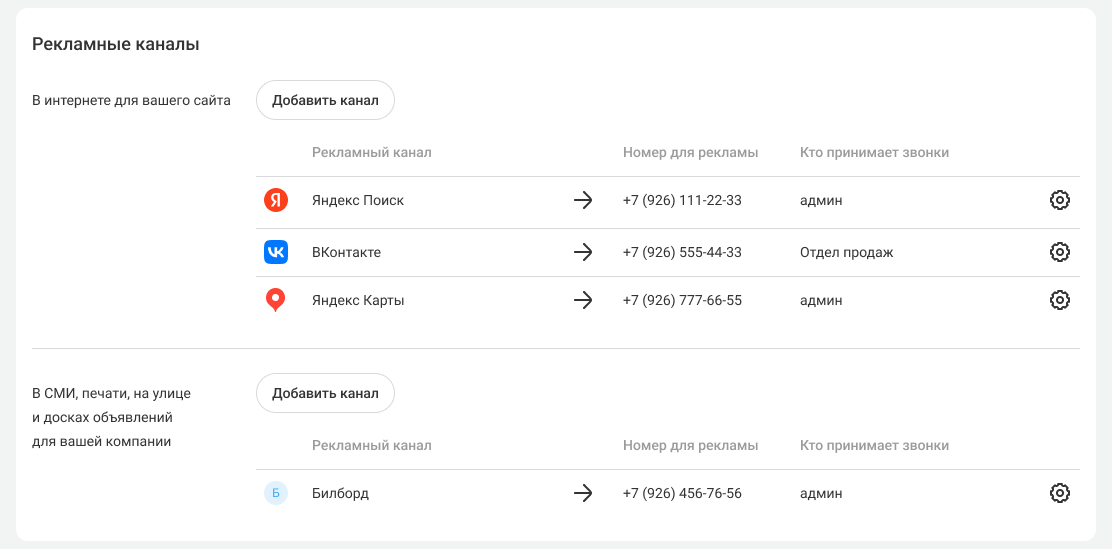 • с разделением по рекламным каналам через несколько номеров — для одновременного запуска рекламы через несколько каналов.
